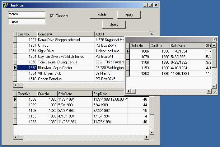 Figure 16.6: The ThinPlus example shows how a dataset field can either be displayed in a grid in a floating window or extracted by a ClientDataSet and displayed in a second form. You'll generally do one of the two things, not both! object cdsDet: TClientDataSet DataSetField = cdsTableOrders end With this setting, you can show the detail dataset in a separate DBGrid placed as usual in the form (the bottom grid of Figure 16.6) or any other way you like. Note that with this structure, the updates relate only to the master table, and the server should handle the proper update sequence even in complex situations. Using the Connection BrokerI've already mentioned that the ConnectionBroker component can be helpful in case you might want to change the physical connection used by many ClientDataSet components of a single program. By hooking each ClientDataSet to the ConnectionBroker, you can change the physical connection of all the ClientDataSets by updating the physical connection of the broker. The ThinPlus example uses these settings: object Connection: TSocketConnection ServerName = 'AppSPlus.AppServerPlus' AfterConnect = ConnectionAfterConnect Address = '127.0.0.1' end object ConnectionBroker1: TConnectionBroker Connection = Connection end object cds: TClientDataSet ConnectionBroker = ConnectionBroker1 end // in the secondary form object cdsQuery: TClientDataSet ConnectionBroker = ClientForm.ConnectionBroker1 end That's basically all you have to do. To change the physical connection, drop a new DataSnap connection component to the main form and set the Connection property of the broker to it. More Provider OptionsI've already mentioned the Options property of the DataSetProvider component, noting that you can use it to add the field properties to the data packet. There are several other options you can use to customize the data packet and the behavior of the client program. Here is a short list: