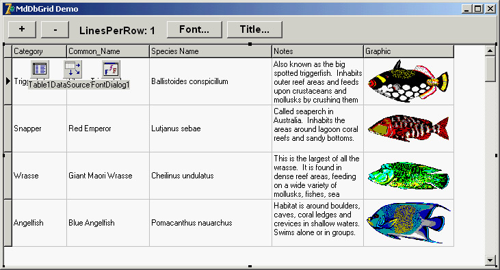 In this code you can see that if the user displays a single line, the grid uses the standard drawing technique with no output for memo and graphic fields. However, as soon as you increase the line count, you'll see better output. To see this code in action, run the GridDemo example. This program has two buttons you can use to increase or decrease the row height of the grid, and two more buttons to change the font. This is an important test because the height in pixels of each cell is the height of the font multiplied by the number of lines. |