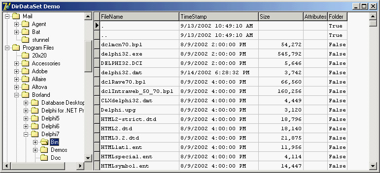 With this dataset available, building the demo program (shown in Figure 17.7) was just a matter of connecting a DBGrid component to the dataset and adding a folder-selection component, the sample ShellTreeView control. This control is set up to work only on files, by setting its Root property to C:\. When the user selects a new folder, the OnChange event handler of the ShellTreeView control refreshes the dataset: procedure TForm1.ShellTreeView1Change(Sender: TObject; Node: TTreeNode); begin MdDirDataset1.Close; MdDirDataset1.Directory := ShellTreeView1.Path + '\*.*'; MdDirDataset1.Open; end;