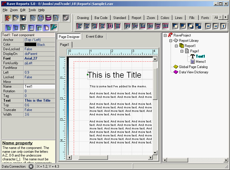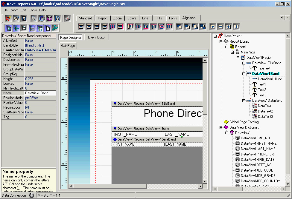 Keep in mind that Rave allows your end users to create or modify their own reports. You can set the Rave Designer level to Beginner, Intermediate, or Advanced in the Edit ® Preferences dialog box (in the Environment section) so your end users will be working at the level they're comfortable with and won't have more power than you want to give them. You can also lock features of the report so they cannot be modified. Page Designer and Event EditorThe central portion of the Rave Designer window hosts the Page Designer (where you lay out the report) and the Event Editor (where you can provide scripts to customize the report at run time). The Page Designer is the most noticeable aspect of Rave. This page is the foundation of a report, where you perform all the designing actions. The page displays a grid pattern, although you can change the look and feel of the page with the preference settings. The names of the current pages being designed appear in the tabs above the Page Designer (Page1 in the figure). The Event Editor allows you to define custom scripting code for the report components. Each component has several different types of events that can be used for calculations, string manipulation, or custom report logic. The Event Editor is an advanced feature of Rave; I'll cover it briefly at the end of this chapter. The Property PanelThe Property panel at left in the Rave Designer helps you customize the way components appear or behave. This panel has a role similar to that of Delphi's Object Inspector: When a component is selected on the page, the Property panel reflects the selection by displaying the different properties associated with that component. If no component is selected, the Property panel is blank. Also as in the Delphi IDE, you can change a property value by editing the contents of the edit box, selecting an option from a drop-down list, or bringing up an editor dialog. You can double-click on any property that has a list of choices (instead of clicking on the down arrow button and selecting the option) to advance to the next item in the list. The Project Tree PanelThe Project Tree panel on the right side of the designer is very informative. It also provides an easy way to navigate a report project's structure. The Project Tree contains three main nodes: Report Library, Global Page Catalog, and Data View Dictionary: