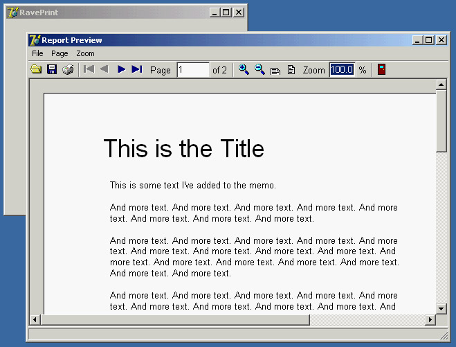 The Status BarAt the bottom of the Rave Designer is the status bar. The status bar provides information about the direct data view connection status and the mouse position and sizing. The data connection LED's color tells you the status of the Rave data system (DirectDataViews): gray and green indicate an inactive or active connection, respectively; yellow and red indicate specific data access situations (respectively, waiting for response or a time-out). The X and Y values are the coordinates of the mouse pointer in page units. When you're dropping a component on the page, if you don't release the mouse button, the size of the component will be shown by the dX and dY values (d stands for delta). Using the RvProject ComponentFigure 18.1 shows a trivial Rave report, which is stored in a .rav file. To connect this report to your Delphi 7 application you use the Rave page, which provides a series of components. The central component is RvProject. Place this component on a form or data module, set its ProjectFile property to a Rave file, and write this event handler code for a button: RvProject1.Execute; You now have a working application (the RavePrint example among the source code files) that can print a report and that includes an embedded print preview feature, as you can see in Figure 18.2. The referenced file should be distributed separately, and can be modified without having to change the Delphi program. As an alternative, you can also embed the .rav file into the Delphi executable by loading it in the DFM file. To accomplish this, use the StoreRAV property of the Rave project component. To control the most important settings of the report and the preview, you can hook an RvNDRWriter or an RvSystem component to the Engine property of the RvProject component: