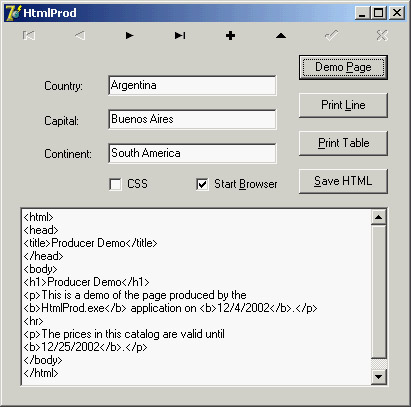 Producing HTML PagesA very simple example of using tags (introduced by the # symbol) is creating an HTML file that displays fields with the current date or a date computed relative to the current date, such as an expiration date. If you examine the HtmlProd example, you'll find a PageProducer1 component with internal HTML code, specified by the HTMLDoc string list: <html> <head> <title>Producer Demo</title> </head> <body> <h1>Producer Demo</h1> <p>This is a demo of the page produced by the <b><#appname></b> application on <b><#date></b>.</p> <hr> <p>The prices in this catalog are valid until <b><#expiration days=21></b>.</p> </html> </body>