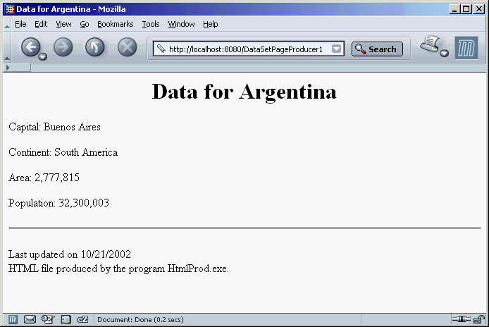 Producing Pages of DataThe HtmlProd example also has a DataSetPageProducer component, which is connected with a database table and with the following HTML source code: <html><head><title>Data for <#name></title></head> <body> <h1><center>Data for <#name></center></h1> <p>Capital: <#capital></p> <p>Continent: <#continent></p> <p>Area: <#area></p> <p>Population: <#population></p><hr> <p>Last updated on <#date><br> HTML file produced by the program <#program>.</p> </body></html> By using tags with the names of the connected dataset's fields (the usual COUNTRY.DB database table), the program automatically gets the value of the current record's fields and replaces them automatically. This produces the output shown in Figure 19.8; the browser is connected to the HtmlProd example working as an HTTP server, as I'll discuss later. In the source code of the program related to this component, there is no reference to the database data: