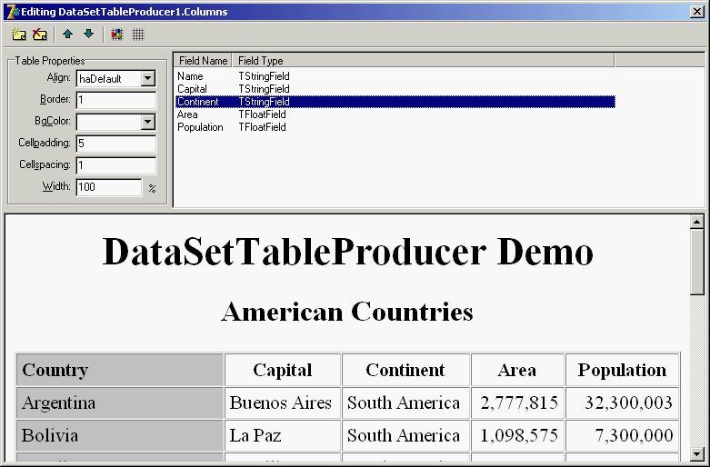 Producing HTML TablesThe third button in the HtmlProd example is Print Table. This button is connected to a DataSetTableProducer component, again calling its Content function and copying its result to the Text of the Memo. By connecting the DataSet property of the DataSetTableProducer to ClientDataSet1, you can produce a standard HTML table. The component by default generates only 20 rows, as indicated by the MaxRows property. If you want to get all of the table's records, you can set this property to -1—a simple but undocumented setting. To make the output of this producer component more complete, you can perform two operations. The first is to provide some Header and Footer information (to generate the HTML heading and closing elements) and add a Caption to the HTML table. The second is to customize the table by using the setting specified by the RowAttributes, TableAttributes, and Columns properties. The property editor for the columns, which is also the default component editor, allows you to set most of these properties, providing at the same time a nice preview of the output, as you can see in Figure 19.9. Before using this editor, you can set up properties for the dataset's fields using the Fields editor. This is how, for example, you can format the output of the population and area fields to use thousands separators.
