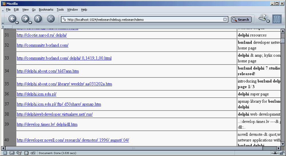 The GrabHtml method is identical to the WebFind example. The HtlStringToCds method is similar to the corresponding method of the WebFind example (which adds the items to a list box); it adds the addresses and their textual descriptions by calling cds.InsertRecord ([0, strAddr, strText]); The ClientDataSet component is set up with three fields: the two strings plus a line counter. This extra empty field is required in order to include the extra column in the table producer. The code fills the column in the cell-formatting event, which also adds the hyperlink: