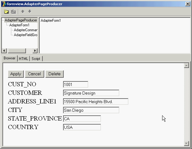 Second, I modified the display of the commands in the grid using the ctAnchor value for the DisplayType property instead of the default button style. Similar properties are available for most components of this architecture to tweak the HTML code they produce. Editing the Data in a FormSome of the commands are connected to a different page, which will be displayed after the commands are invoked. For example, the edit command's PageName property is set to formview. This second page of the application has an AdapterPageProducer with components hooked to the same DataSetAdapter as of the other table, so that all the requests will be automatically synchronized. If you click the Edit command, the program will open the secondary page that displays the data of the record corresponding to the command. Listing 20.3 shows the details of the page producer for the program's second page. Again, building the HTML form visually using the Delphi-specific designer (see Figure 20.11) was a very fast operation.