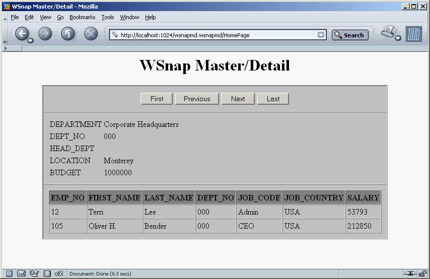 This WebSnap application's only page has an AdapterPageProducer component hooked to both dataset adapters. The page's form has a field group hooked to the master and a grid connected with the detail. Unlike other examples, I tried to improve the user interface by adding custom attributes for the various elements. I used a gray background, displayed some of the grid borders (HTML grids are often used by Web Surface Designer), centered most of the elements, and added spacing. Notice that I added extra spaces to the button captions to prevent them from being too small. You can see the related code in the following detailed excerpt and the effect in Figure 20.12: