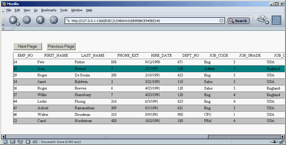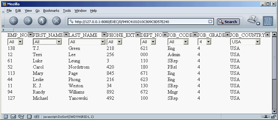 Figure 21.10: The grid of the IWClientGrid example supports custom sorting and filtering without re-fetching the data on the web server. This functionality is possible because the data is moved to the browser within the JavaScript code. Here is a snippet of one of the scripts embedded in the page's HTML: <script language="Javascript1.2"> var IWDYNGRID1_TitleCaptions = ["EMP_NO","FIRST_NAME","LAST_NAME","PHONE_EXT", "DEPT_NO","JOB_CODE","JOB_GRADE","JOB_COUNTRY"]; var IWDYNGRID1_CellValues = new Array(); IWDYNGRID1_CellValues[0] = [2,'Robert','Nelson','332','600','VP',2,'USA']; IWDYNGRID1_CellValues[1] = [4,'Bruce','Young','233','621','Eng',2,'USA']; IWDYNGRID1_CellValues[2] = [5,'Kim','Lambert','22','130','Eng',2,'USA']; IWDYNGRID1_CellValues[3] = [8,'Leslie','Johnson','410','180','Mktg',3,'USA']; IWDYNGRID1_CellValues[4] = [9,'Phil','Forest','229','622','Mngr',3,'USA'];