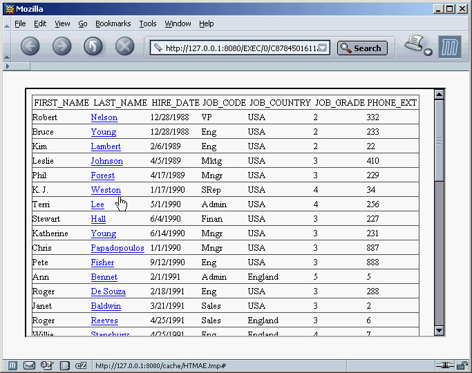 Linking to DetailsThe grid of the IWScrollData example shows a single page of a table's data; buttons let you scroll up and down the pages. An alternative grid style in IntraWeb is offered by framed grids, which can move larger amounts of data to the web browser within a screen area of a fixed size using a frame and an internal scroll bar, as a Delphi ScrollBox control does. This is demonstrated by the IWGridDemo example. The example customizes the grid in a second powerful way: It sets the Columns collection property of the grid. This setting allows you to fine-tune the output and behavior of specific columns, for example by showing hyperlinks or handling clicks on items or title cells. In the IWGridDemo example, one of the columns (the last name) is turned into a hyperlink; the employee number is passed as a parameter to the follow-up command, as you can see in Figure 21.8.