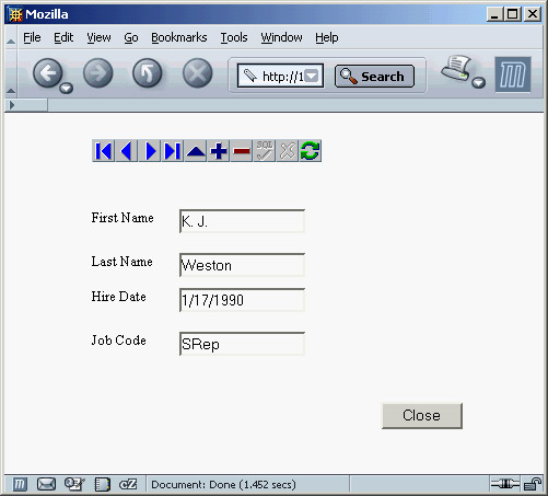The secondary form is hooked to the same data module as the main form. So, after the database data is updated, you can see it in the grid (but the updates are kept only in memory, because the program doesn't have an ApplyUpdates call). The secondary form uses a few edit controls and a navigator, provided by IntraWeb. You can see this form at run time in Figure 21.9. Moving Data to the Client SideRegardless of how you use it, the IWDBGrid component produces HTML with the database data embedded in the cells, but it cannot work on the data on the client side. A different component (or a set of IntraWeb components) allows you to follow a different model. The data is sent to the browser in a custom format, and the JavaScript code on the browser populates a grid and operates on the data, moving from record to record without asking more data to the server.