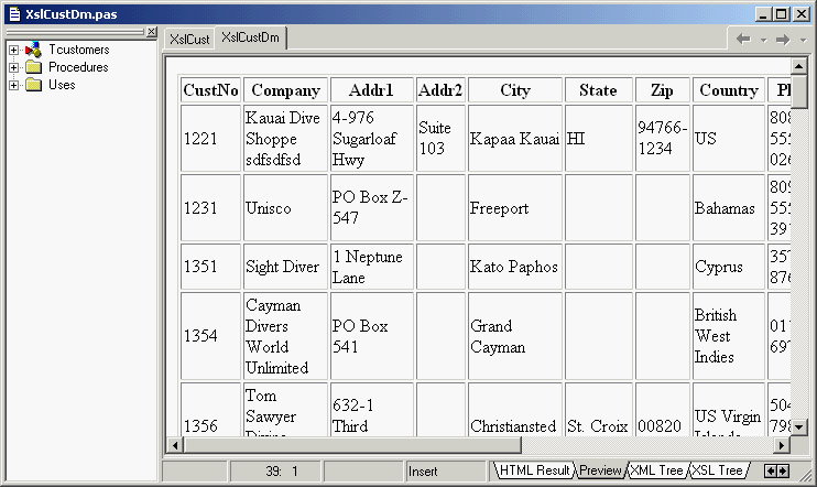To make this example work, you must provide data to the XSLPageProducer component via its XMLData property. This property can be hooked up to an XMLDocument or directly to an XMLBroker component, as I've done in this case. The broker takes its data from a provider connected to a local table attached to the classic Customer.cds component table of the classic DBDEMOS. The effect is that, with the following Delphi-generated XSL, you get (even at design time) the output of shown in Figure 22.12: <?xml version="1.0"?>