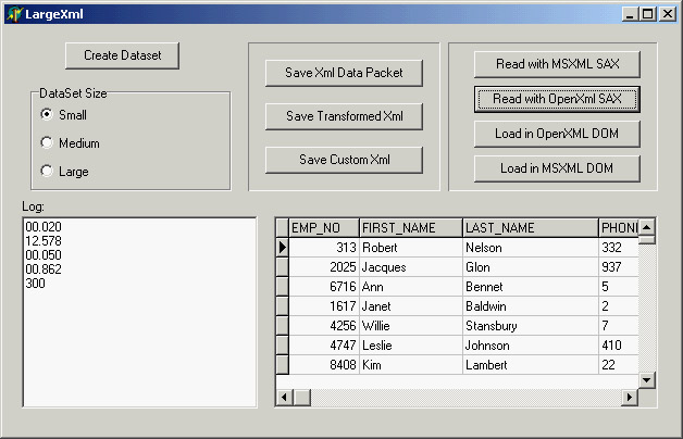 Processing Large XML DocumentsAs you have seen, there are often many different techniques to accomplish the same task with XML. In many cases you can choose any solution with the goal of writing less and more maintainable code; but when you need to process a large number of XML documents or very large XML documents, you must consider efficiency. Discussing theory by itself is not terribly useful, so I've built an example you can use (and modify) to test different solutions. The example is called LargeXml, and it covers a specific area: moving data from a database to an XML file and back. The example can open a dataset (using dbExpress) and then replicate the data many times in a ClientDataSet in memory. The structure of the in-memory ClientDataSet is cloned from that of the data access component: SimpleDataSet1.Open; ClientDataSet1.FieldDefs := SimpleDataSet1.FieldDefs; ClientDataSet1.CreateDataSet; After using a radio group to determine the amount of data you want to process (some options require minutes on a slow computer), the data is cloned with this code: