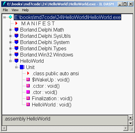 Notice how similar the code looks to the Delphi applications you're used to. The only difference is the uses clause. Borland has organized the units of the Delphi library into namespaces similar to those of the Common Language Runtime (CLR). I will discuss this in more detail in the next chapter. Save the file as HelloWorld.dpr and open a command window. Navigate to the location of the file and type dccil HelloWorld.dpr The result should be an executable image, HelloWorld.exe, which you can run from the command line to produce a single line of output. If you are using the IDE plug-in, compiling and running the program will involve pressing Ctrl+F9 or F9 after you've enabled IDE hijacking (see the Hijack IDE menu item in the screenshot above). If this program seems boring, you can begin your exploration of .NET using the windowed version of the hello world program instead of the console version. Called HelloWin, this program creates and shows a window on the screen, writing into its caption. It also shows the call to Application.Run, used to activate the application's message processing loop: program HelloWin; uses System.Windows.Forms, Borland.Delphi.SysUtils; var aForm: Form; begin aForm := Form.Create; aForm.Text := 'Hello Delphi'; Application.Run (aForm); end. In .NET presentations, the previous code raises the enthusiasm of programmers used to Microsoft development tools. As a Delphi programmer, you might have used almost this same code since 1995, so you might wonder where this excitement comes from. The output of these programs is far from interesting, but you can at least prove they are not classic Win32 applications by running ILDASM on them (directly from the plug-in's menu). You can see the output for the HelloWorld executable in Figure 24.1. Notice that the unit's global code is wrapped in a pseudo class called uUnit. Unlike Delphi, the .NET runtime doesn't account for global procedures and functions, but only class methods. But I'm getting ahead of myself; let's start from the beginning and look at the NET platform. |