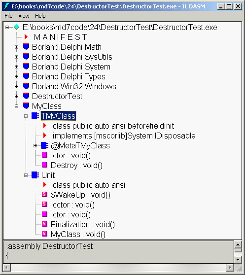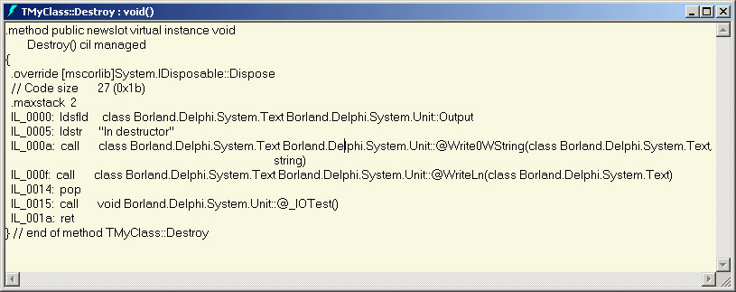 After compiling this program you can run it; but we are not so much interested in running the program as in inspecting it with ILDASM. Start ILDASM and select File | Open. Navigate to the directory where DestructorTest.exe is located, and open it. You will see a window similar to that shown in Figure 24.2. The tree entry labeled MyClass represents the namespace created to hold all the symbols in the unit. Expand the MyClass node and notice the entries for TMyClass and Unit. Delphi for .NET creates a CLR class for each unit to implement initialization and finalization and also to let you still write global routines; they become methods of that Unit class. Expand the node for TMyClass and notice the Destroy node, which has a pink block. This node represents the Destroy method in TMyClass. Double-click the Destroy node to open a window displaying the full IL code for this method, as shown in Figure 24.3. The line you're looking for uses the .override directive: .override [mscorlib]System.IDisposable::Dispose This is an explicit override, and it says that the Destroy method is the implementation of Dispose in the IDisposable interface. The .override directive is how the thread of execution winds up in your destructor when Dispose is called from Free.