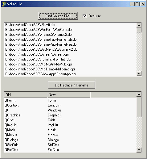 The program's source code is available in the Tools folder of the book's source code. The VclToClx program converts unit names (based on a configuration file) and handles the DFM issue by renaming the DFM files to XFM and fixing the references in the source code. The program is unsophisticated—it doesn't parse the source code but instead looks for occurrences of the unit names followed by a comma or semicolon, as happens in a uses statement. It also requires the unit name to be preceded by a space, but you can modify the program to look for a comma. Don't skip this extra test; otherwise the Forms unit will be converted to QForms, but the QForms unit will be re-converted to QQForms!