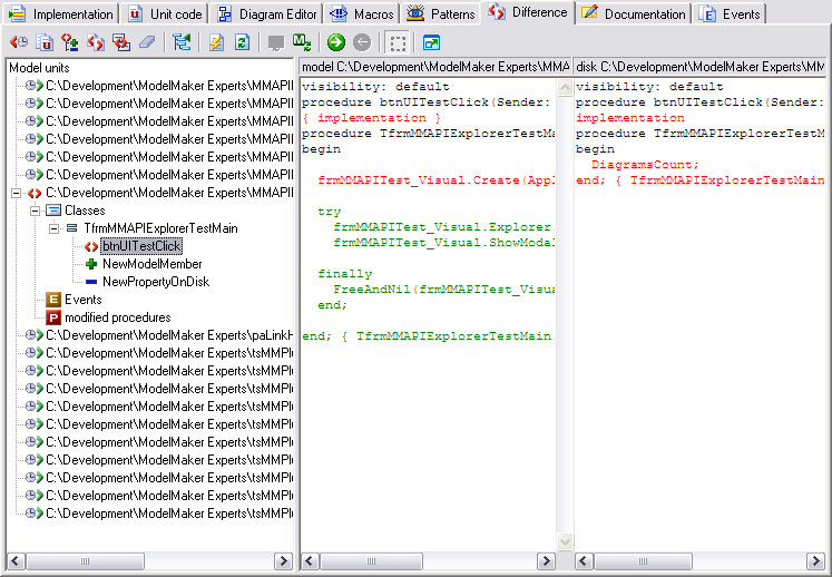 The Difference ViewAs I mentioned earlier, it's easy to get into a situation where your model is out of synch with your source files. If both your model and your source files have been edited, you can't simply regenerate the files from the model, lest you overwrite the source file changes. Likewise, you can't re-import the units, for fear of eliminating the changes to the model. Fortunately, ModelMaker offers one of the most robust differencing tools I've seen. When you find your model out of synch, it's time to visit the Difference tab (see Figure 11.8). ModelMaker offers a variety of ways to view differences. You can view a standard text file comparison, time stamp differences, or even a comparison of two selected classes within the model. My favorite is on display in Figure 11.8—a structured difference. ModelMaker temporarily imports the source file on disk (thereby objectifying it just like the internal code model) and compares the imported file with the same unit and classes in the model on an object and attribute level rather than as text. The result is a much faster, much more accurate comparison. Notice in the tree view in Figure 11.8 the icons that denote differences. The red <> indicates that both the model and the source file contain the indicated class member (btnUITestClick in the example) but the two instances differ. The differing code is displayed in the memo controls to the right. The green + in the tree view indicates that the indicated class member exists only in the model, not on the disk. The blue – indicates that the class member exists only on disk, not in the model. With this information, you can choose how to proceed in re-synchronizing your model. One nifty feature is the ability to re-import a selected method (rather than the whole unit) from within the Difference view. This approach implies that it is very important to know when your model is out of synch, so you don't override your changes on disk when regenerating the source files. Fortunately, ModelMaker offers several safeguards that can prevent this situation. One of these is a Design Critic (see the "Little-Known Tidbits" section later in the chapter). If your Design Critics are enabled, ModelMaker's Message View will warn you when a file on disk has changed: The Event Types ViewModelMaker enables the management of event types on the Events tab; there you can edit event type declarations. But keep in mind that although a new event type may exist in ModelMaker's internal code model, it does not exist in a source file until you add the event type's declaration to a unit. The easiest way to manage that process is to drag the event type declaration from the Events view list to the Unit list and drop the item into a unit. |