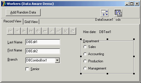 The DBCheckBox component is slightly different; it is used to show and toggle an option, corresponding to a Boolean field. It is a limited list because it has only two possible values plus the undetermined state for fields with null values. You can determine which are the values to send back to the database by setting the ValueChecked and ValueUnchecked properties of this component. The DbAware ExampleThe DbAware example highlights the usage of a DBRadioGroup control with the settings discussed in the previous section and a DBCheckBox control. This example is not much more complex than earlier ones, but it has a form with field-oriented data-aware controls, instead of a grid encompassing them all. You can see the example's form at design time in Figure 13.3. As in the MyBase2 program, the application defines its own table structure, using the FieldDefs collection property of the ClientDataSet. Table 13.1 provides a short summary of the fields defined.